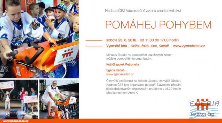 Nadace ČEZ v rámci charitativní akce " POMÁHEJ POHYBEM" pomohla podpořit náš spolek. Díky šlapajícím návštěvníků na festivalu Vysmáté léto v Kadani nám Nadace ČEZ věnovala částku  50 652,-Kč.